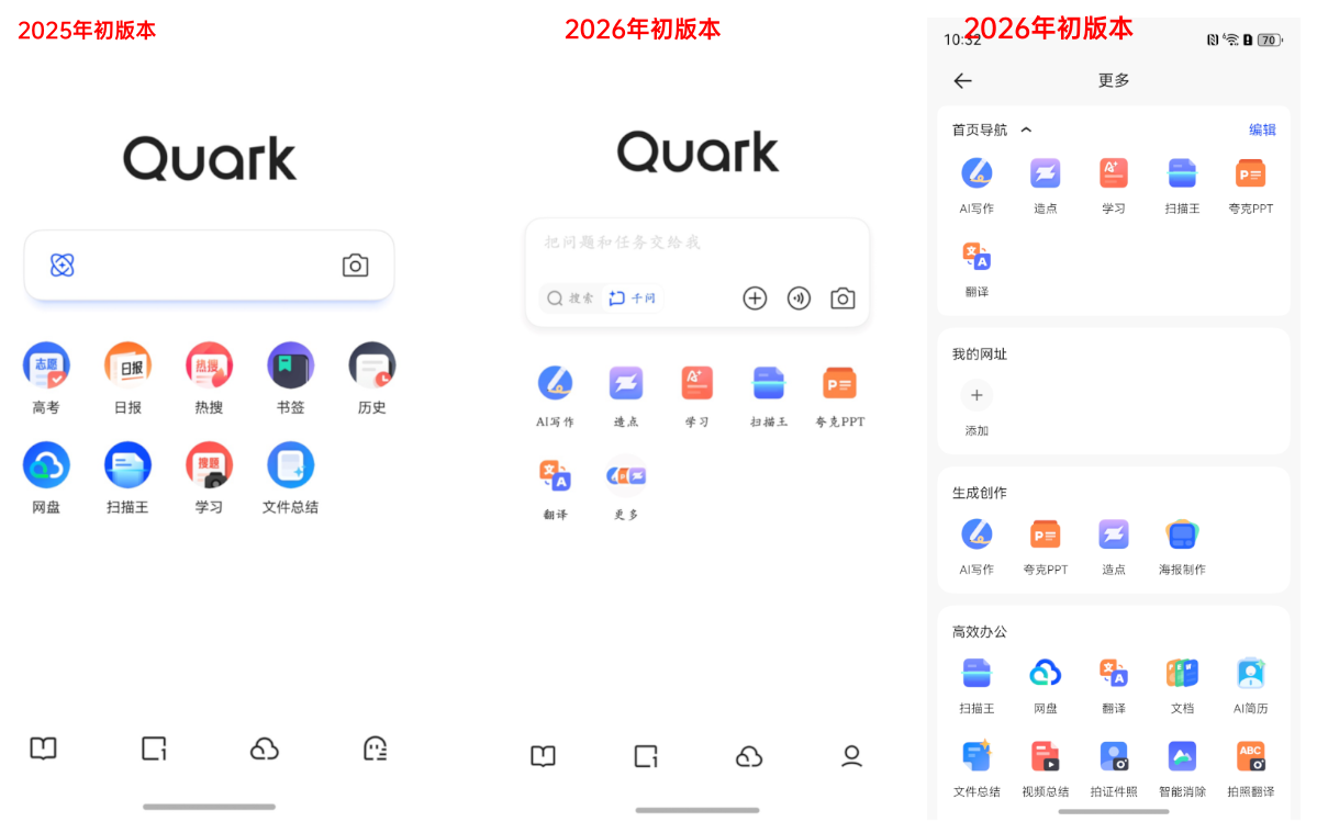 除此之外,阿里系的夸克在这一年时间的成长也非常快。2025 年 1 月的版本中,首页功能还是“基础款”,只有搜索框和高考、日报、热搜等 9 个入口,而到 2026 年 1 月的版本,搜索框中引入了千问,还增加了语音、上传文件等功能,同时首页的功能入口也极大丰富,点开“更多”,可以看到各种常用功能都已经支持了。