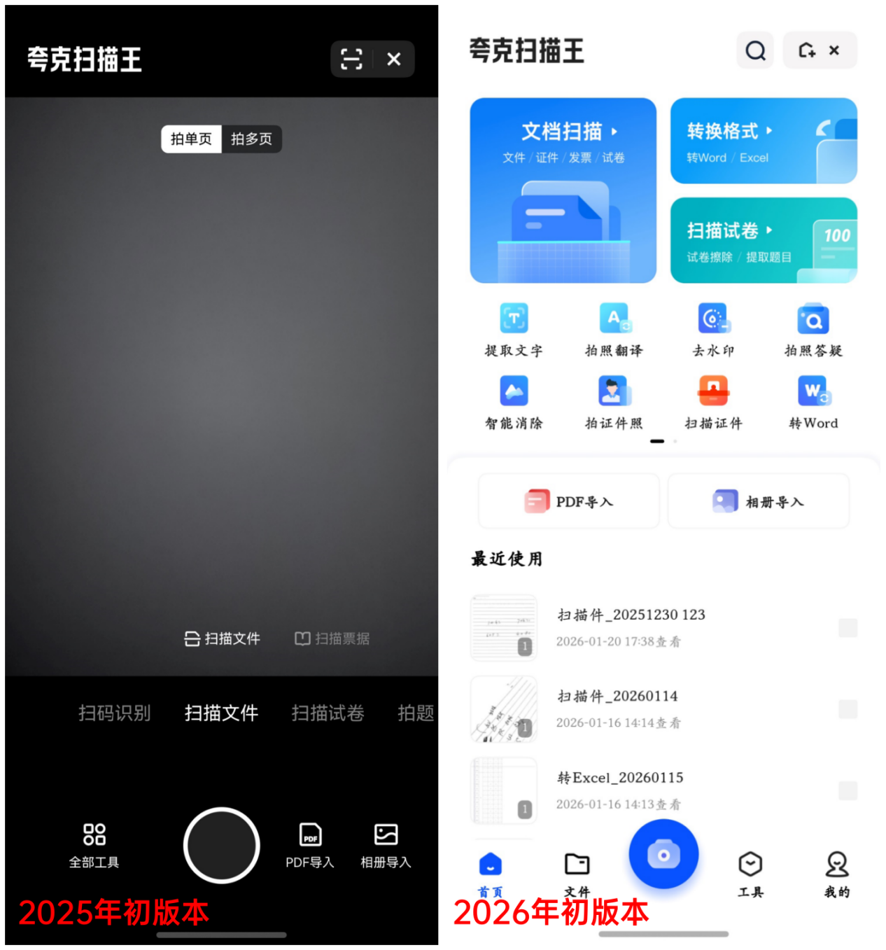 再看夸克内置的扫描王的功能,2025 年 1 月的版本还比较简陋,只有扫码识别、扫描文件、试卷、拍题等几个功能,而现在 2026 年 1 月的版本,夸克扫描王已经十分完善,各种扫描、格式转换、智能消除等功能都备齐了。