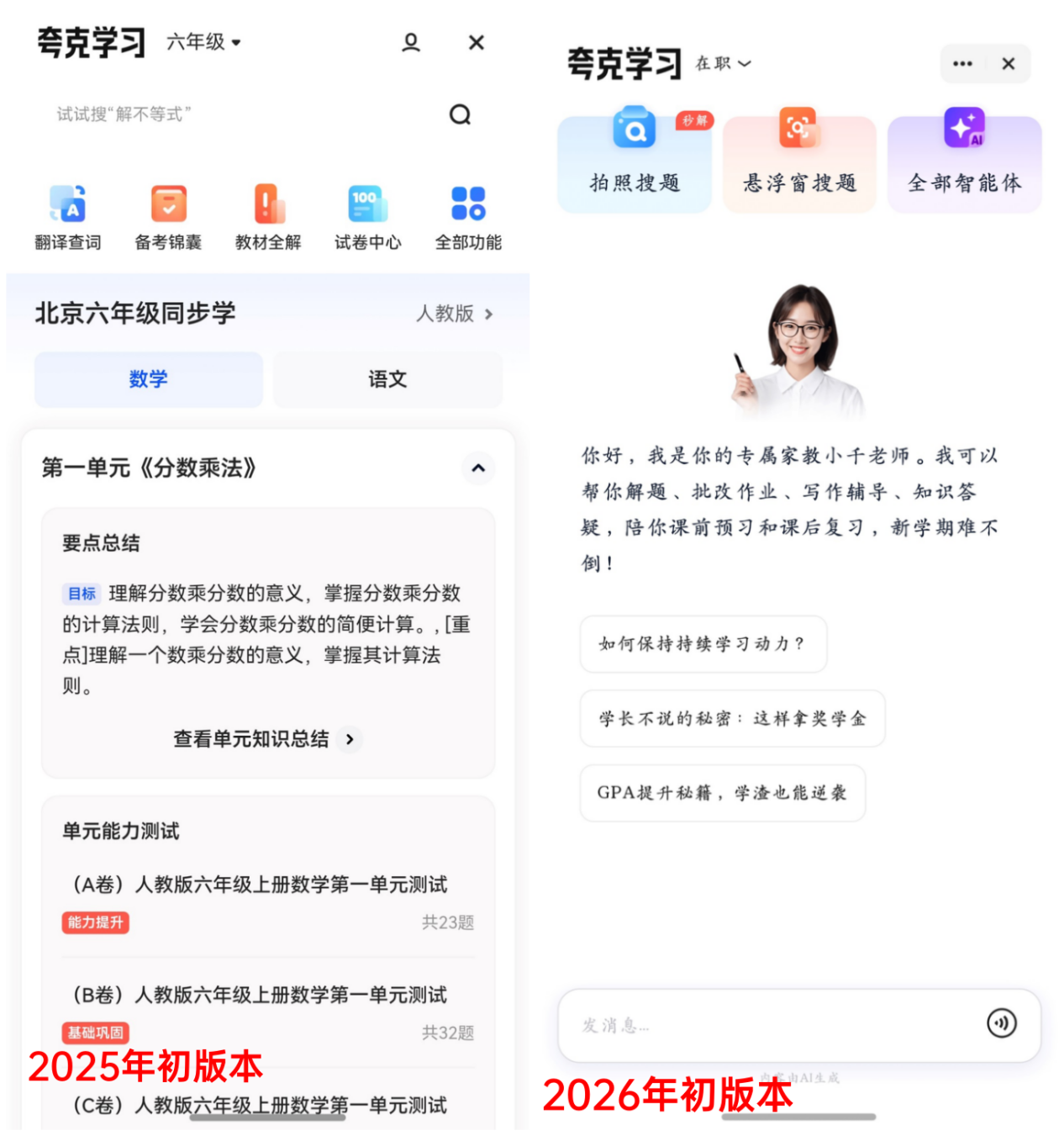再比如夸克学习的功能,去年 1 月的版本也是比较简单的,而现在不仅功能更丰富,还引入了千问助手、智能体教学。