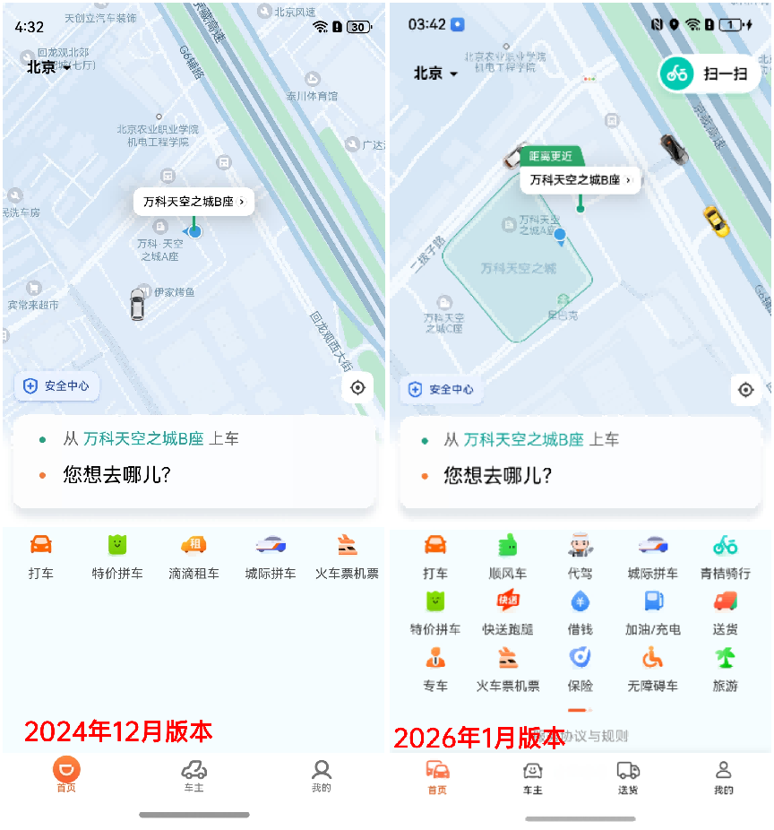 鸿蒙版滴滴出行:从“基础”到“创新”,鸿蒙特色功能拉满体验在出行领域,我们出门打车常用的滴滴出行,过去一年的变化也是脱胎换骨,从首页就能看出来,在 2024 年 12 月的版本中,首页只有打车、拼车、火车票机票等几个功能,而到 2026 年 1 月,功能就丰富很多了,顺风车、代驾、骑行、送货等等功能,满足了更多出行场景的需求。