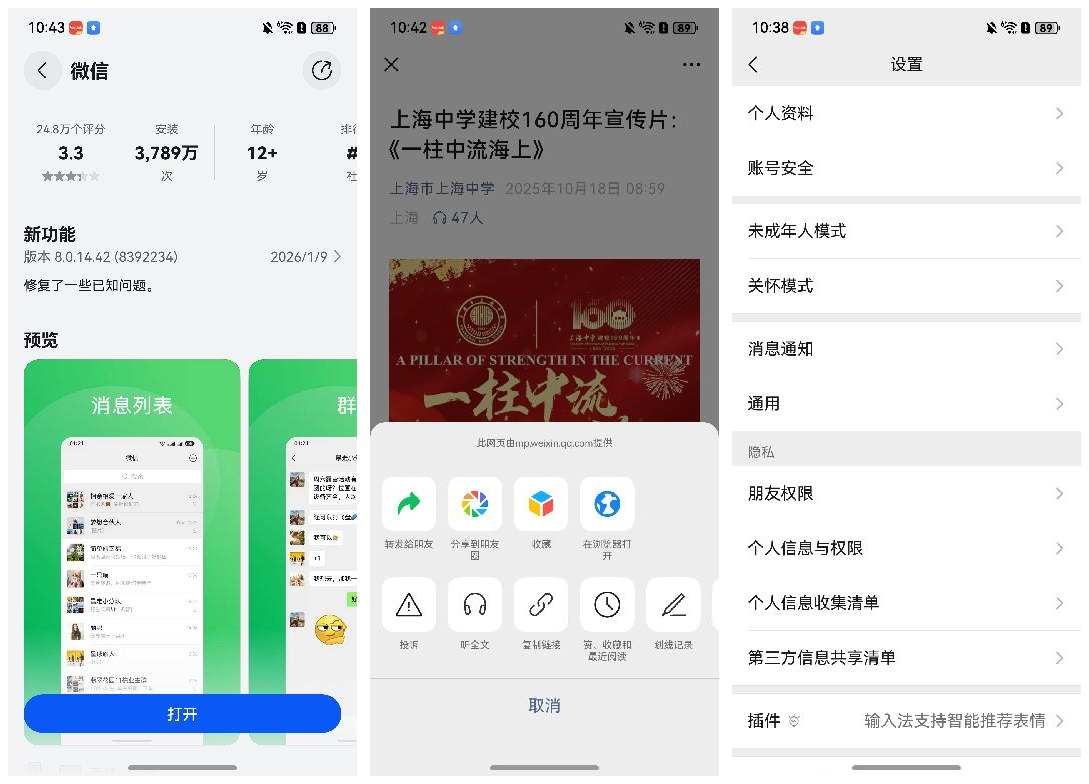 再看现在 2026 年初 8.0 版本的鸿蒙版微信,功能大大丰富了,比如文章分享界面,分享到朋友圈、收藏、还有语音朗读、投诉等重要功能都已经补齐。设置界面的选项也极大丰富,个人资料、关怀模式、朋友权限、插件等等各种功能都齐全了。总之一眼就能看出来前后的巨大差别。