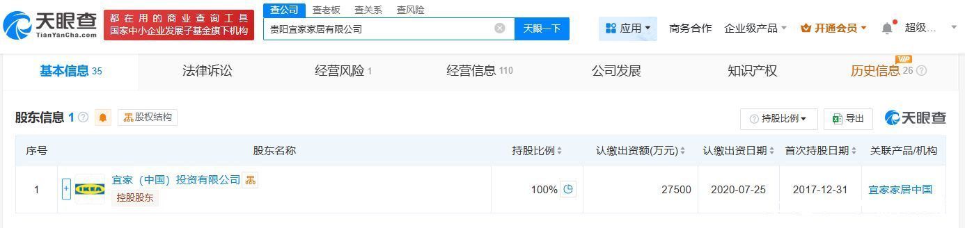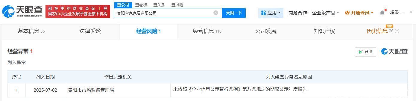 天眼查App显示,近日,贵阳宜家家居有限公司因未依照规定期限公示年度报告,被贵阳市市场监督管理局列入经营异常名录。