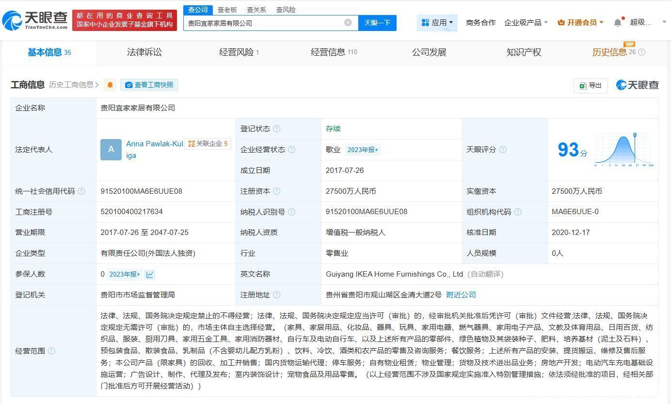 该公司成立于2017年7月,法定代表人为Anna Pawlak-Kuliga,注册资本2.75亿人民币,经营范围包括家具、家居用品、化妆品、器具的零售及咨询服务等,由宜家(中国)投资有限公司全资持股。