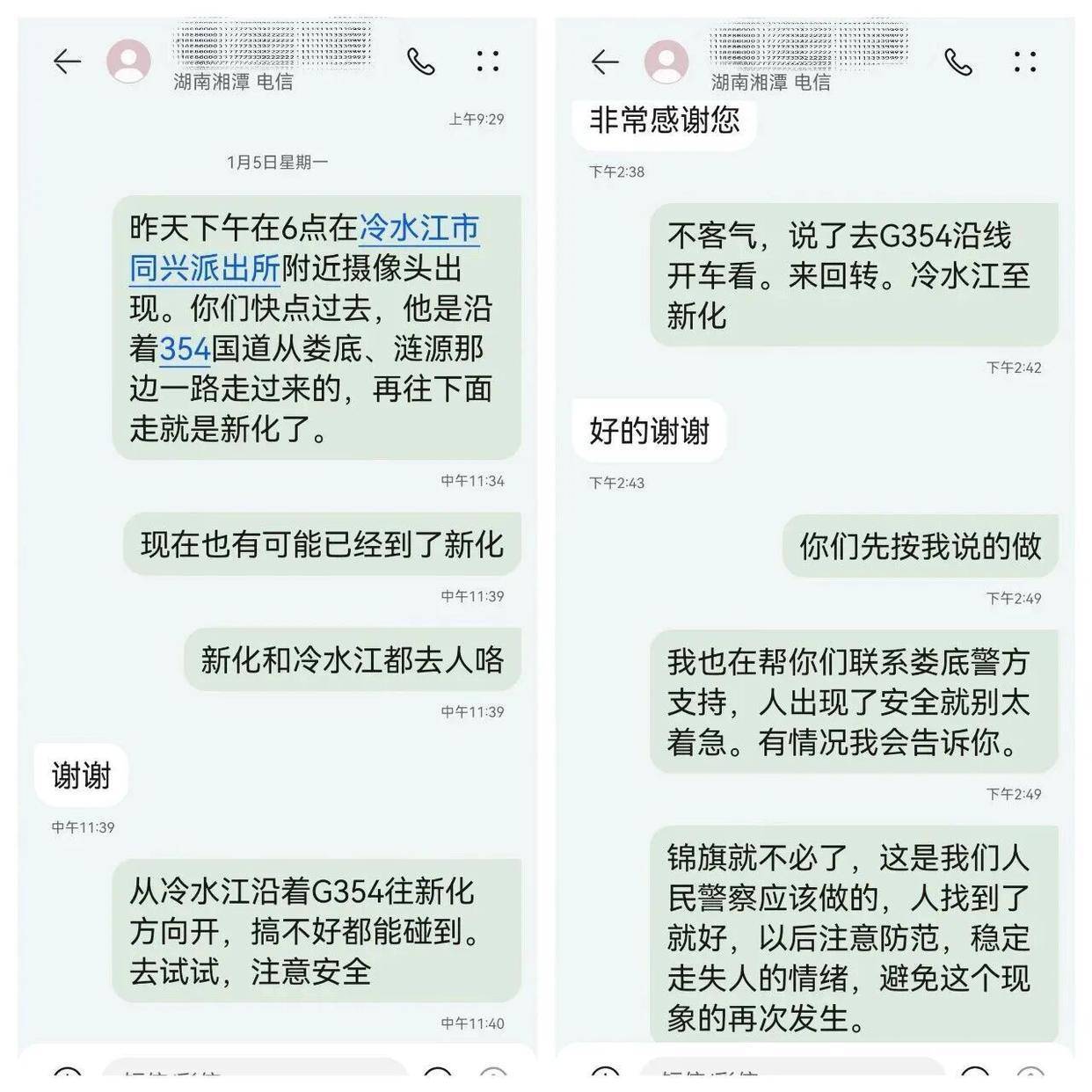 1月5日,事情迎来转机。吴浩通过娄底警方发现,前一日下午王安顺在冷水江一派出所附近出现过!他当即通知家属,“他是沿着G354国道从娄底、涟源那边一路走过来的,再往下面走就是新化,现在也有可能到了新化。沿线从冷水江往新化方向开,搞不好能碰到!”