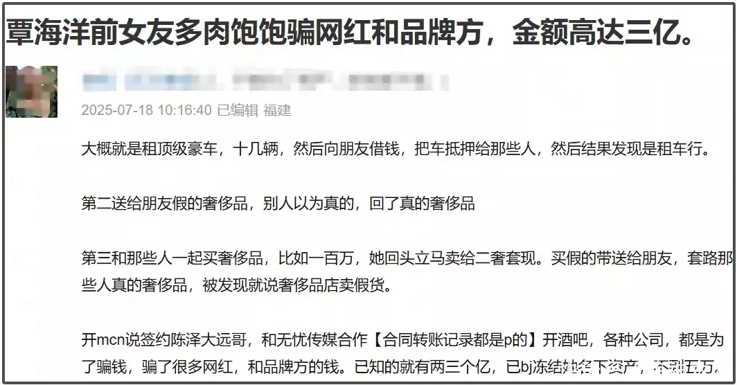 包括多肉饱饱自曝给覃海洋买名牌手表和奢侈品,都是为骗钱做准备,送给覃海洋的名牌手表就是假的,转了一圈回来,她又用“覃海洋戴过的手表”背书,再借一次钱。
