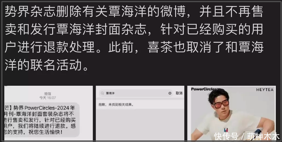 出轨风波发酵之后,品牌删除了覃海洋联名合作、拍摄杂志中止发售下架退款,连央视都下架了覃海洋演唱歌曲。